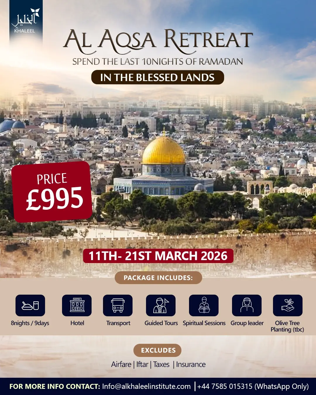 Experience the final nights of Ramadan in one of the most sacred and spiritually charged places on earth. The Al Aqsa Retreat is a carefully curated journey combining worship, learning, reflection, and connection — designed to deepen your relationship with Allah during the most powerful days of the year.